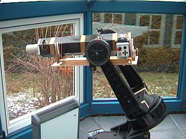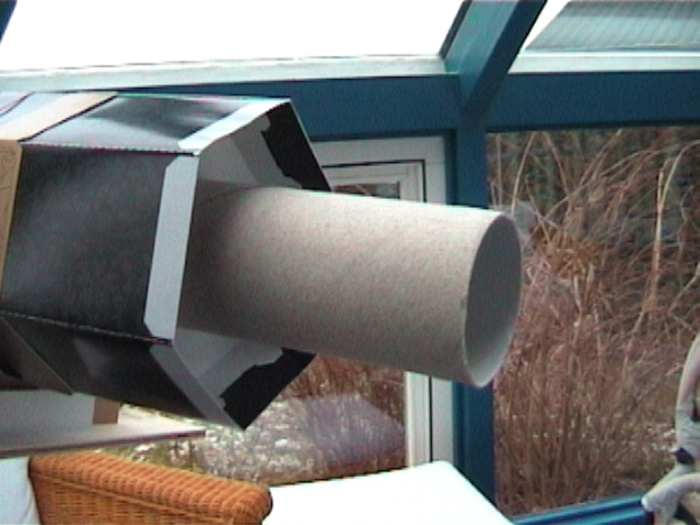 Die Filterfolie für den Sonnefilter-Vorsatz wurde anders als in der Bauanleitung vorgeschlagen, nicht festgeklebt, sondern nur lose eingelegt und festgeklemmt. Die Sicherheit des Vorsatzes wurde dadurch nicht beeinträchtigt, die Folie war