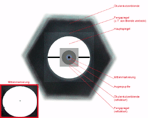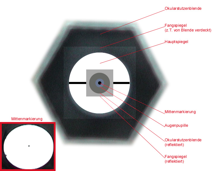 Zur Verbesserung der Kollimation versah ich den Hauptspiegel vor den nächsten Aufnahmen mit einer Mittenmarkierung. Beim Einblick in den Okularstutzen konnte nun das Fangspiegelquadrat zentrisch vor der Hauptspiegelscheibe und beides zusammen mittig zur Okularstutzenblende ausgerichtet werden. Eine gute Kollimation konnte dann einfach dadurch erreicht werden, daß Augenpupille und Mittenmarkierung zur Deckung gebracht wurden.