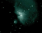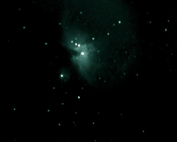 Die Aufnahme von M42 demonstriert sehr schön die Leistungsfähigkeit des Kartonteleskopes. 100 Einzelbilder je 12/50s wurden mit Giotto gemittelt und im Anschluß grün getönt, um in etwa den visuellen Eindruck von M42 wiederzugeben.
