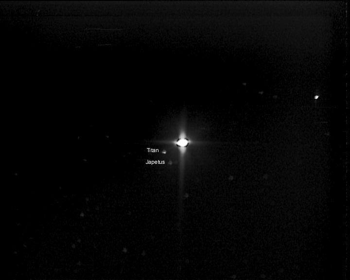 Immerhin zeigt die Aufnahme neben Saturn dessen Riesenmond Titan und Japetus, der in relativ großer Entfernung Saturn umkreist. Saturn selbst erscheint wie Jupiter im Primärfokus bei 450mm Brennweite viel zu klein, um irgendwelche Oberflächendetails erkennen zu können.