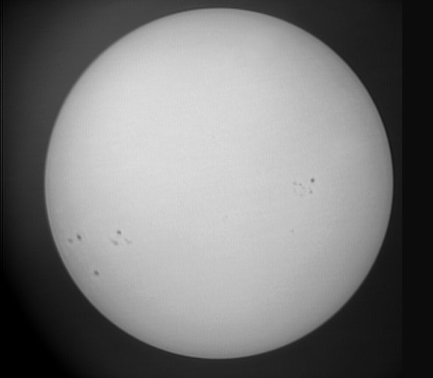 Die nebenstehende Aufnahme der Sonne vom 7.1.2003 wurde aus 50 gemittelten Einzelbildern je 1/2000 s mit dem Bildbearbeitungsprogramm Giotto von Georg Dittiè erzeugt. Die Aufnahmebedingungen waren nicht optimal, da die Sonne nicht sehr hoch über dem Horizont stand und leichte Schleierbewölkung herrschte.