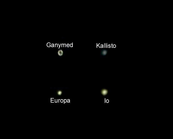 Vergleich der Albedo von Europa, Ganymed, Io und Kallisto, 4-fach digital vergrößert