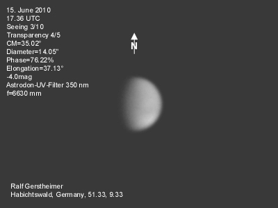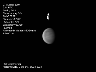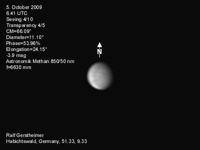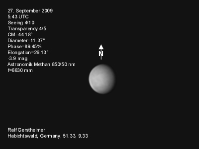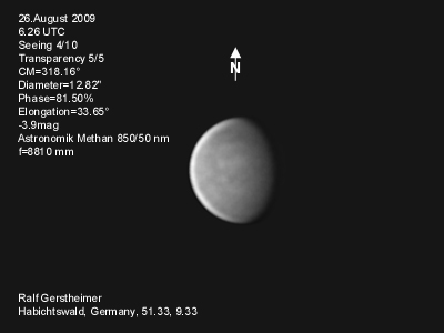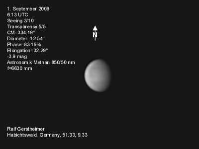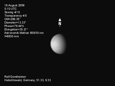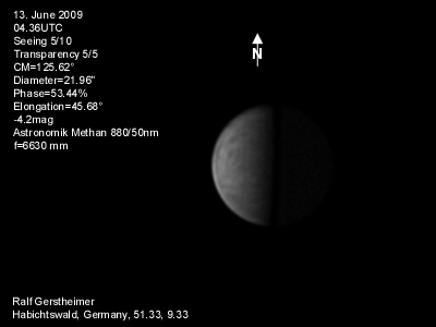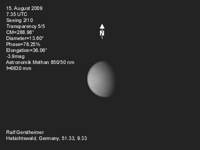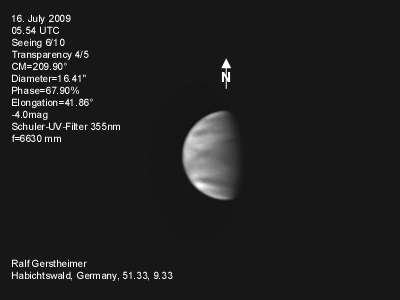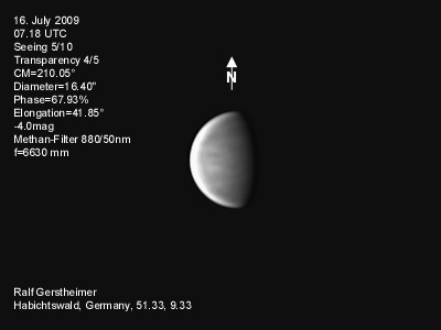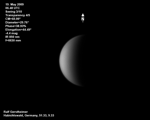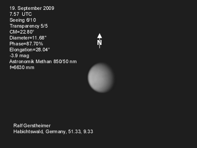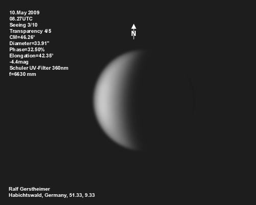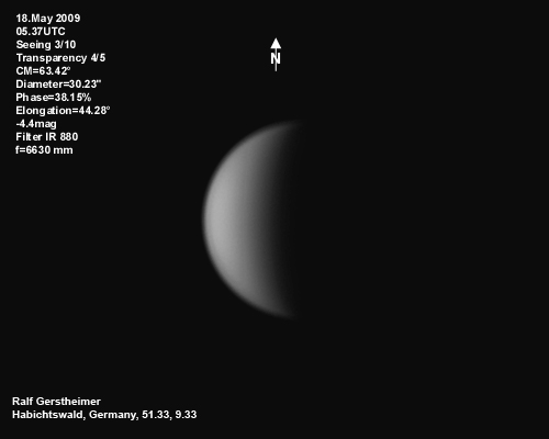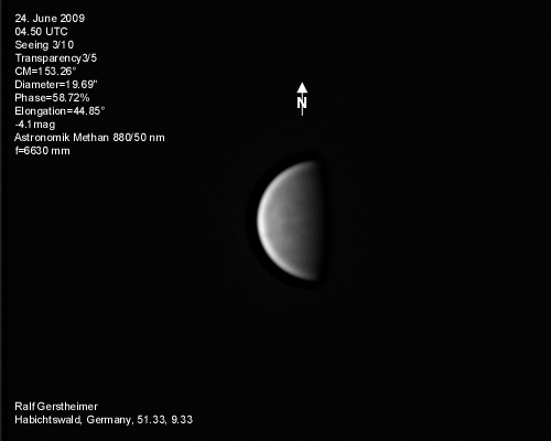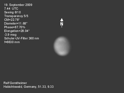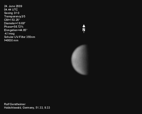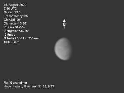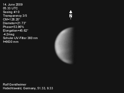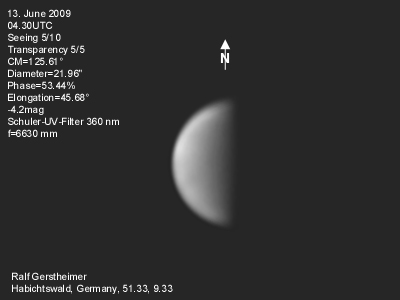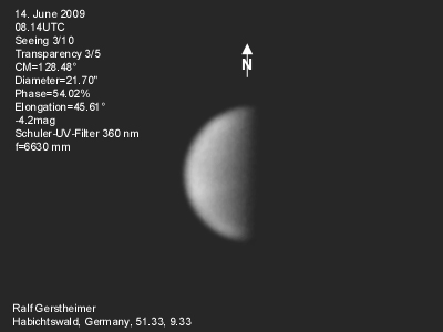 16.1.2009-15:15ut ZM=214,08° Durchmesser: 24,81" Elongation v. d. Sonne: 47,11° Beleuchtung: 50,21 %
